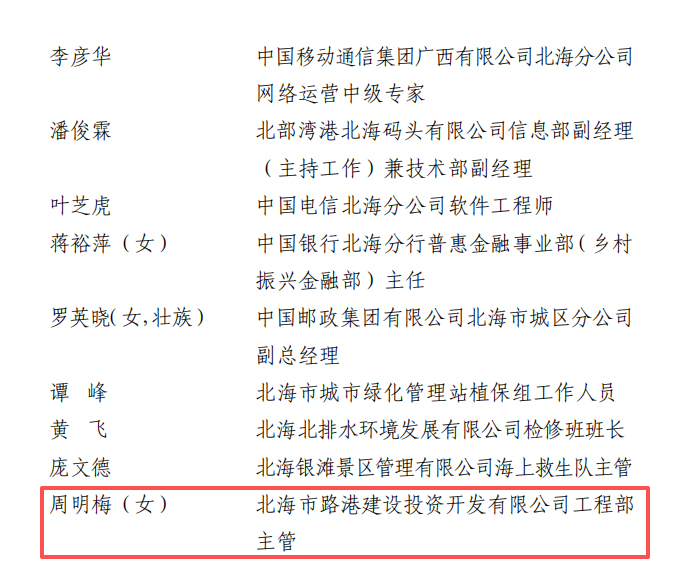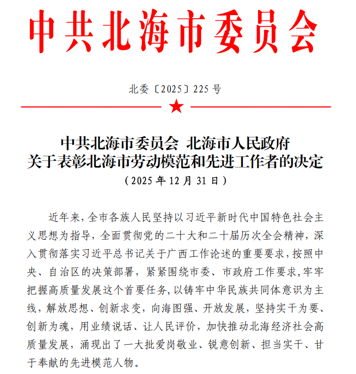 近日,中共北海市委员会、北海市人民政府印发《关于表彰北海市劳动模范和先进工作者的决定》(北委〔2025〕225号),对在全市高质量发展中涌现出的先进模范人物予以表彰,授予罗成等66人北海市劳动模范称号,授予裴润济等34人北海市先进工作者称号。其中,我公司周明梅同志荣获“2025年北海市劳动模范”称号。
