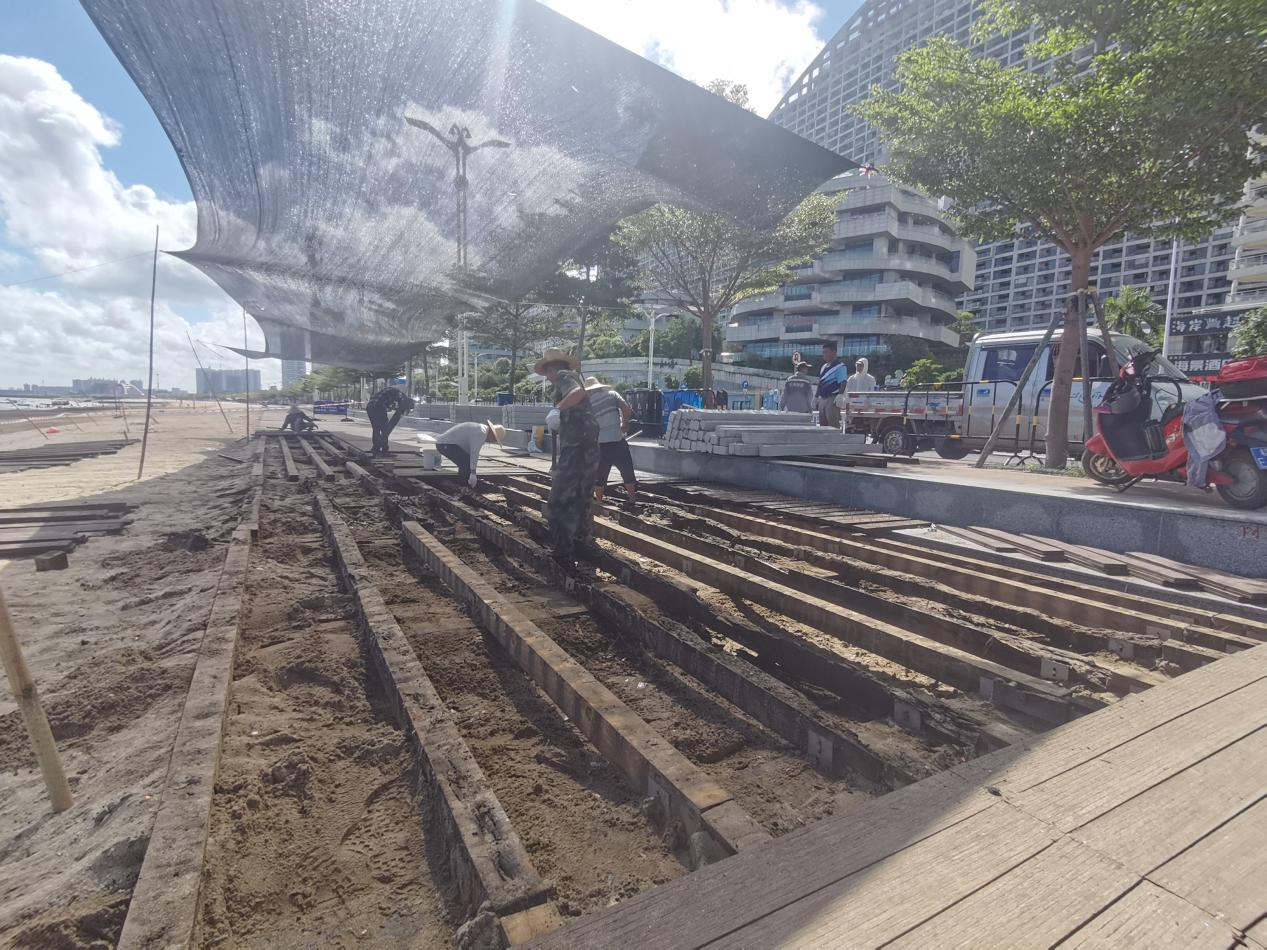 受海洋气候及日照高温影响,廉州湾大道木栈道出现多处防腐木龙骨受潮腐烂及面板松动、塌陷、脱空等问题。市委、市政府对此高度重视,市365英国上市公司、相关政府部门积极作为、想方设法筹措维修资金,在7月初开始全面修缮木栈道--将已坏防腐木龙骨更换为混凝土龙骨。