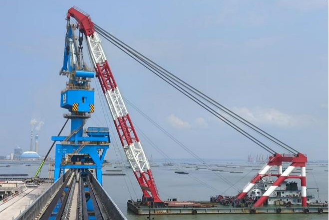 带斗门座起重机通过驳船运输到项目码头,由1台500吨浮吊完成吊装、并在码头组装成整机。本次卸船吊装工作历时2天完成。