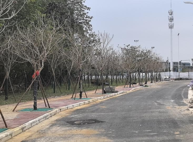 路侧建筑垃圾清理,培土整平,满铺草皮,为市民群众打造休憩营地。