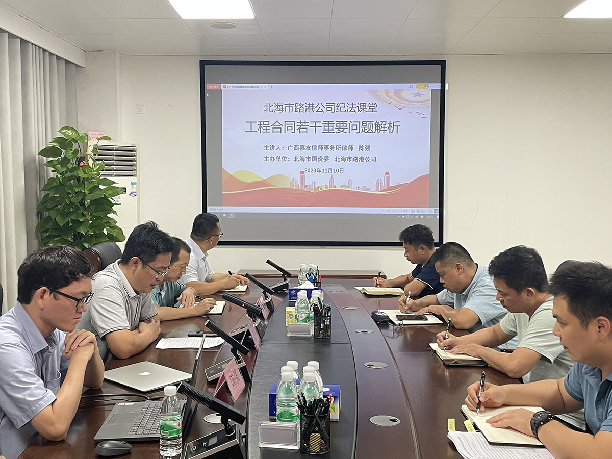 11月10日,北海市365英国上市公司在公司五楼会议室举办纪法课堂专题讲座,特邀广西嘉友律师事务所陈强律师作题为《工程合同若干重要问题解析》专题讲座。公司工程一部、工程二部、发展部等7个部门50余人参加。