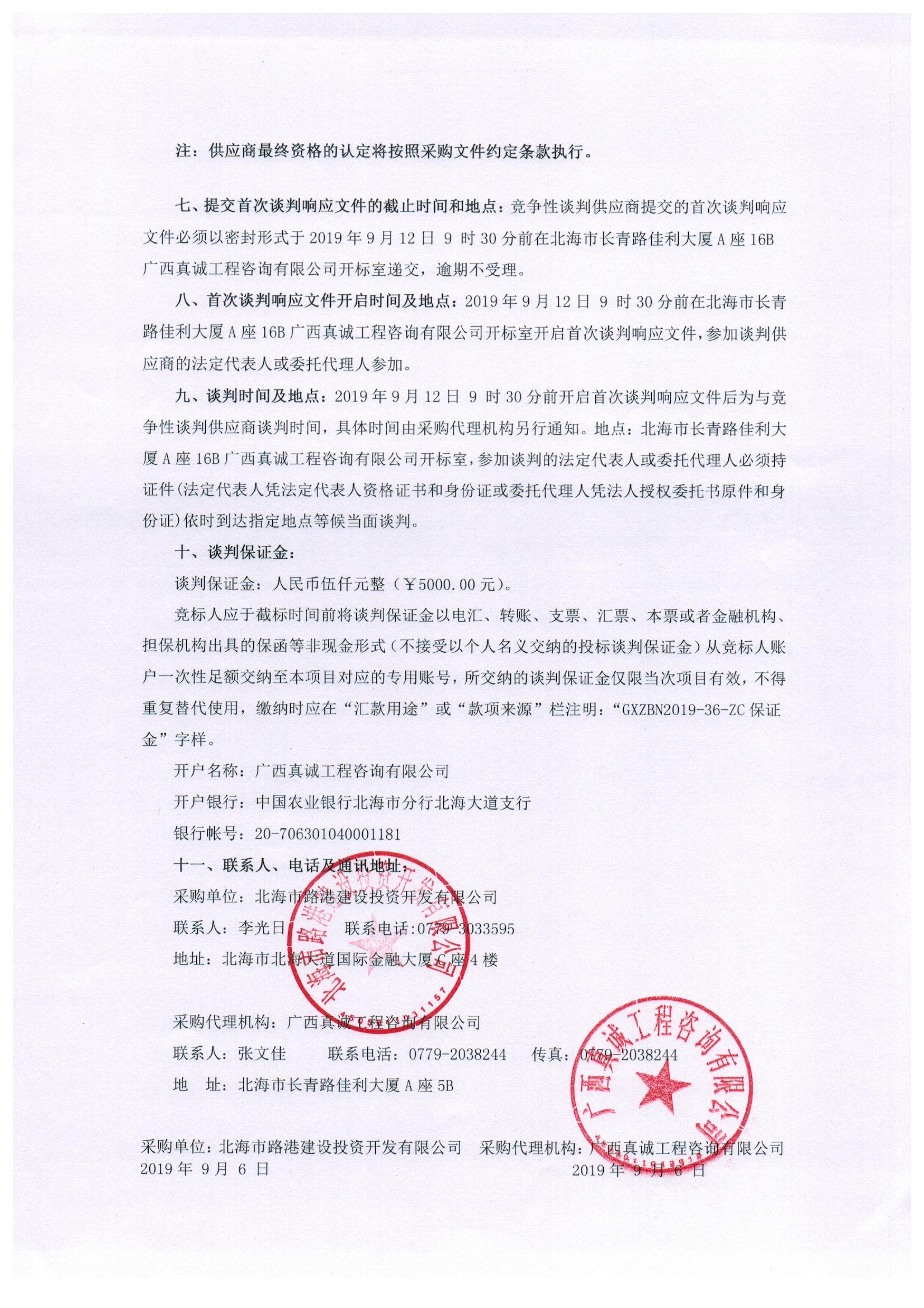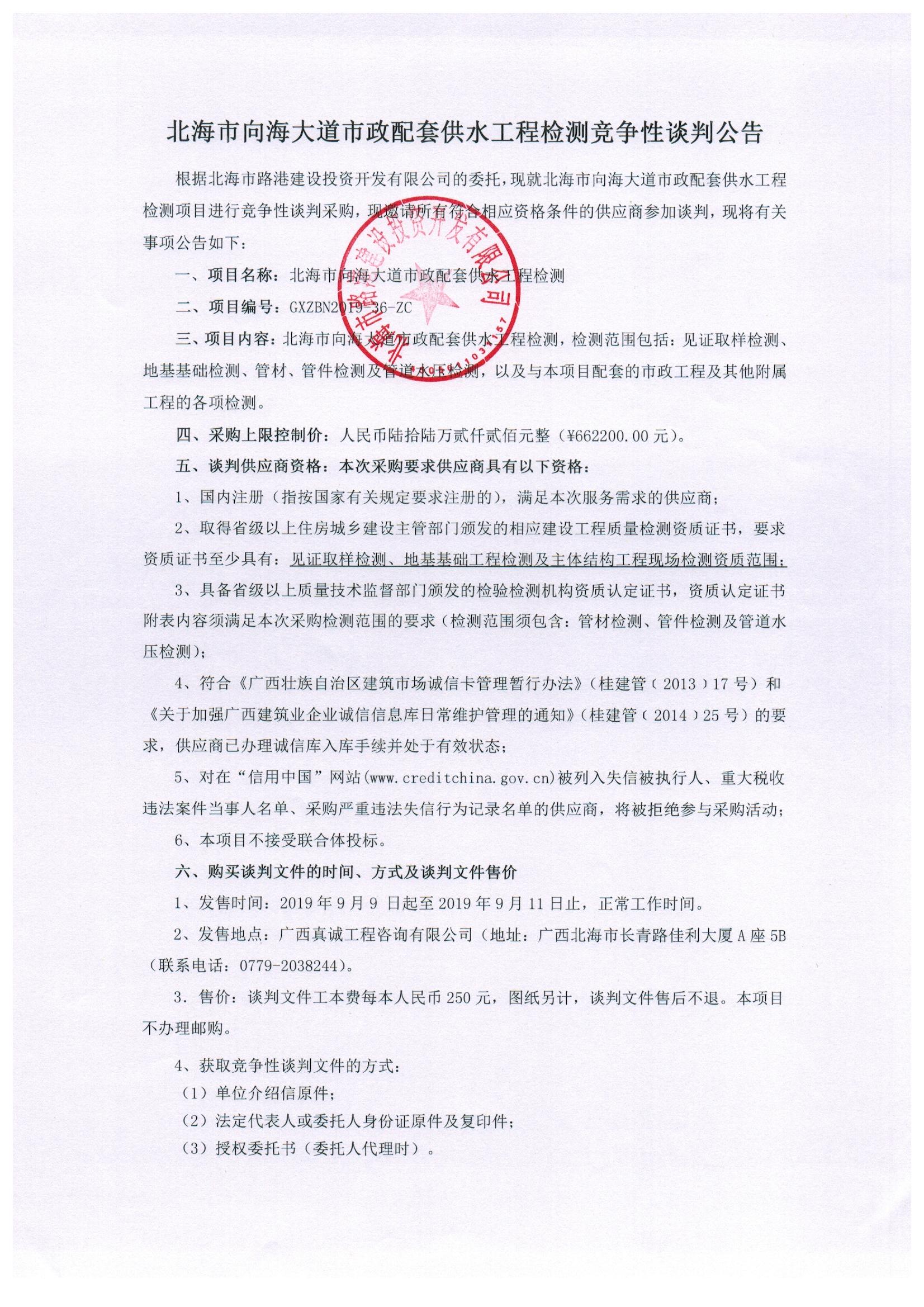 北海市向海大道市政配套供水工程检测竞争性谈判公告