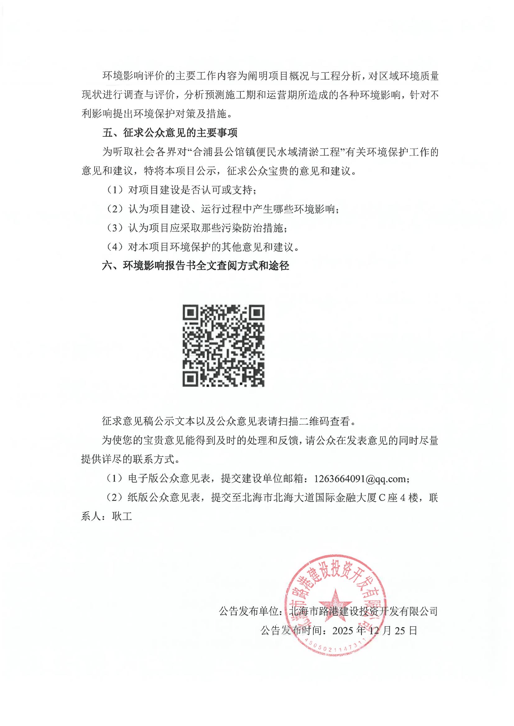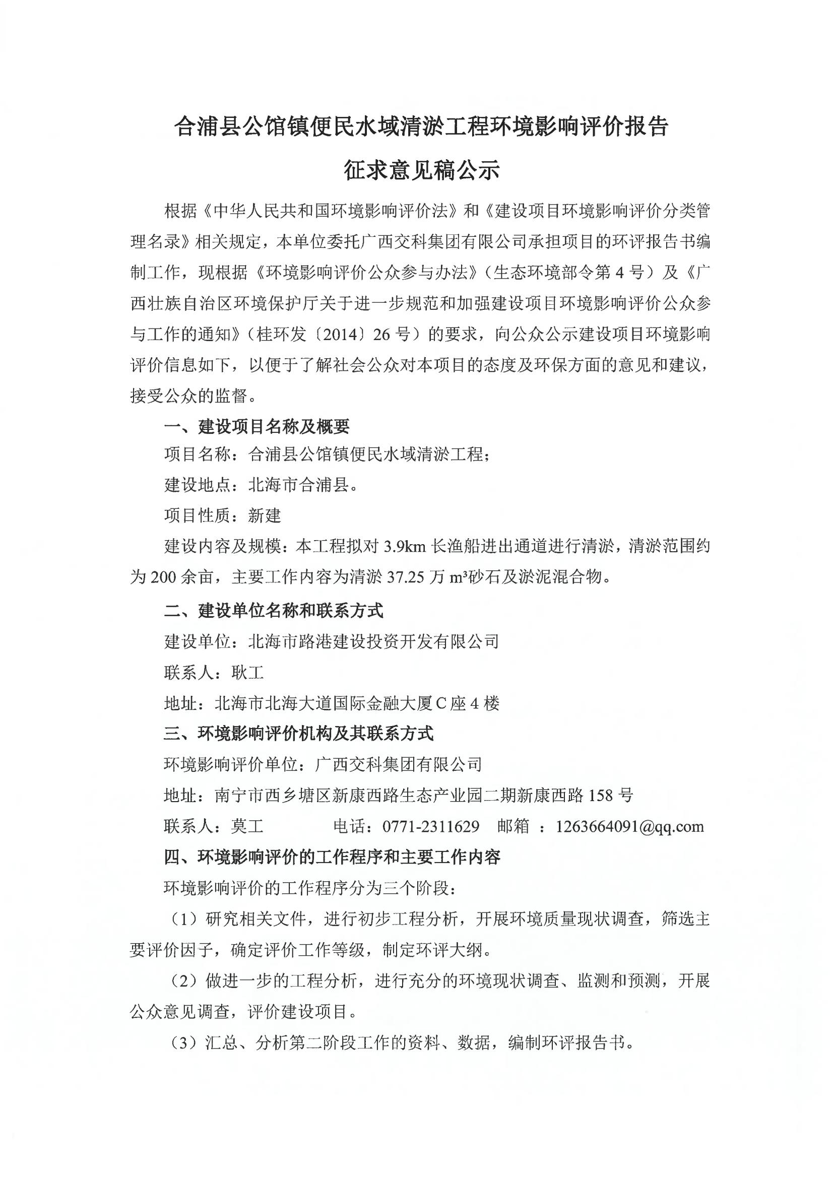 合浦县公馆镇便民水域清淤工程环境影响评价报告征求意见稿公示