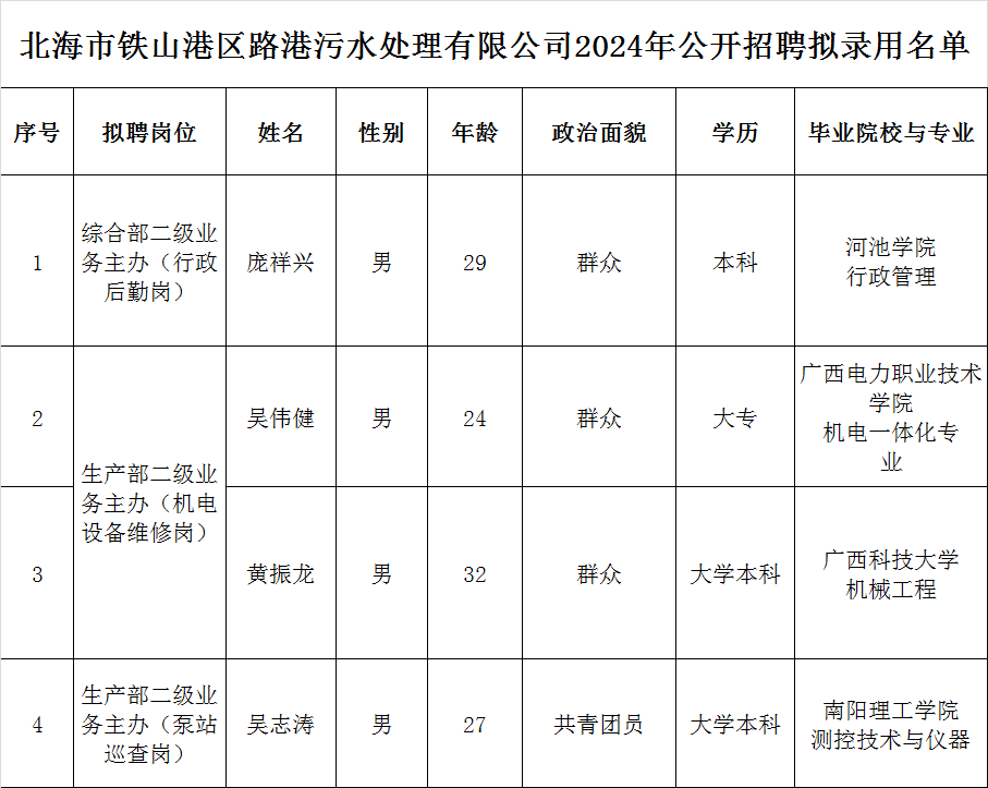 2.北海市铁山港区365英国上市污水处理有限公司2024年公开招聘拟录用名单
